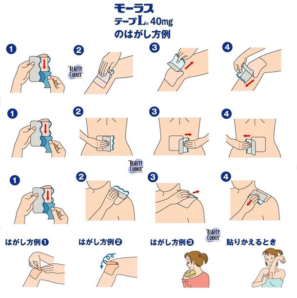 1天1次患部粘貼,請按照指示的使用方法。先將患部清潔,透明的膜揭貼在患處。有傷口,濕疹和粘膜或皮疹的部位請不要貼。